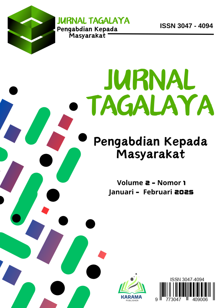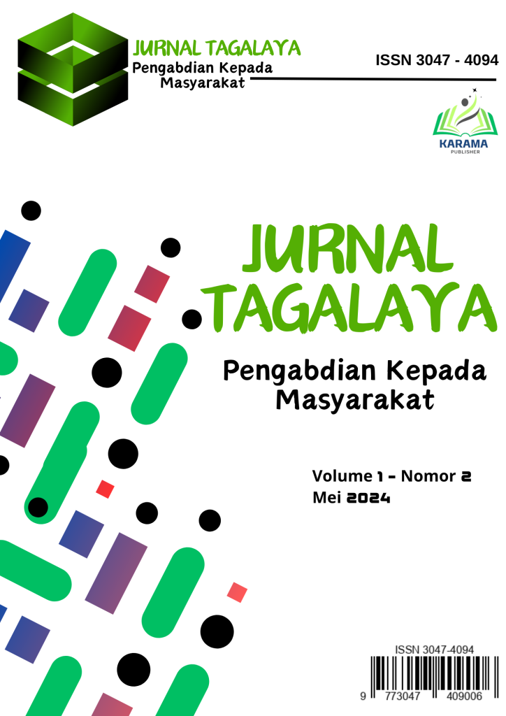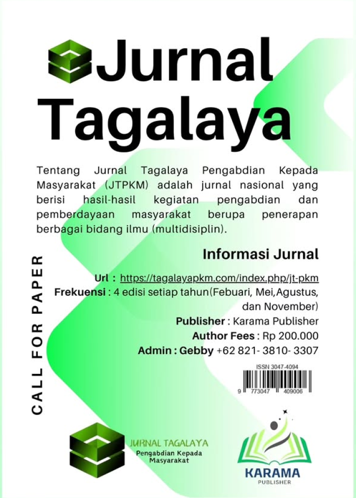 Jurnal Tagalaya Pengabdian kepada Masyarakat (JTPKM) adalah jurnal nasional yang berisi hasil-hasil kegiatan pengabdian dan pemberdayaan masyarakat berupa penerapan berbagai bidang ilmu (multidisiplin). Jurnal Tagalaya Pengabdian kepada Masyarakat (JTPKM) terdaftar di BRIN dengan dan E-ISSN : 3047-4094